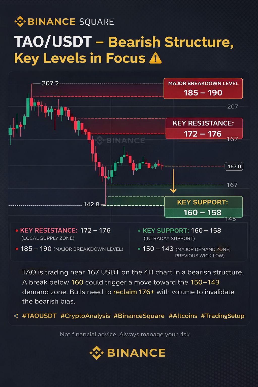 $TAO is currently trading around 167 USDT on the 4H timeframe after a strong bearish leg from the 207 high, followed by a sharp capitulation move that printed a swing low near 142.8. Since then, price has entered a weak consolidation phase, forming lower highs and showing signs of distribution rather than strength.