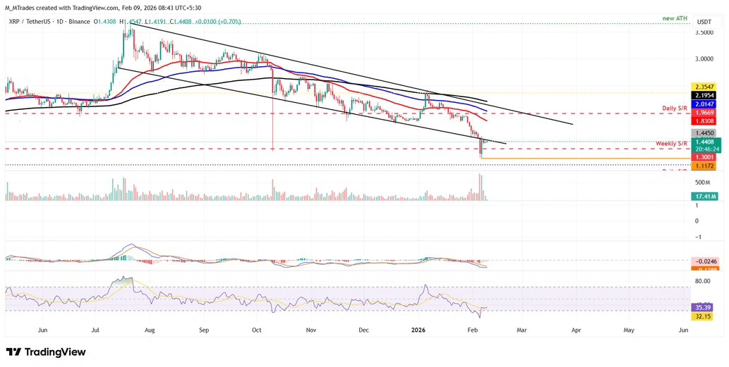 Ripple ($XRP ): Negociando a $1.44, probando la línea de tendencia inferior del cuña bajista rota. ¿Posibilidad de un ascenso a $1.83 si la reclama? Riesgo a la baja hacia el soporte semanal de $1.30. Indicadores de momentum parpadeando en rojo – ¡traders, manténganse alerta! 🌊 #XRP