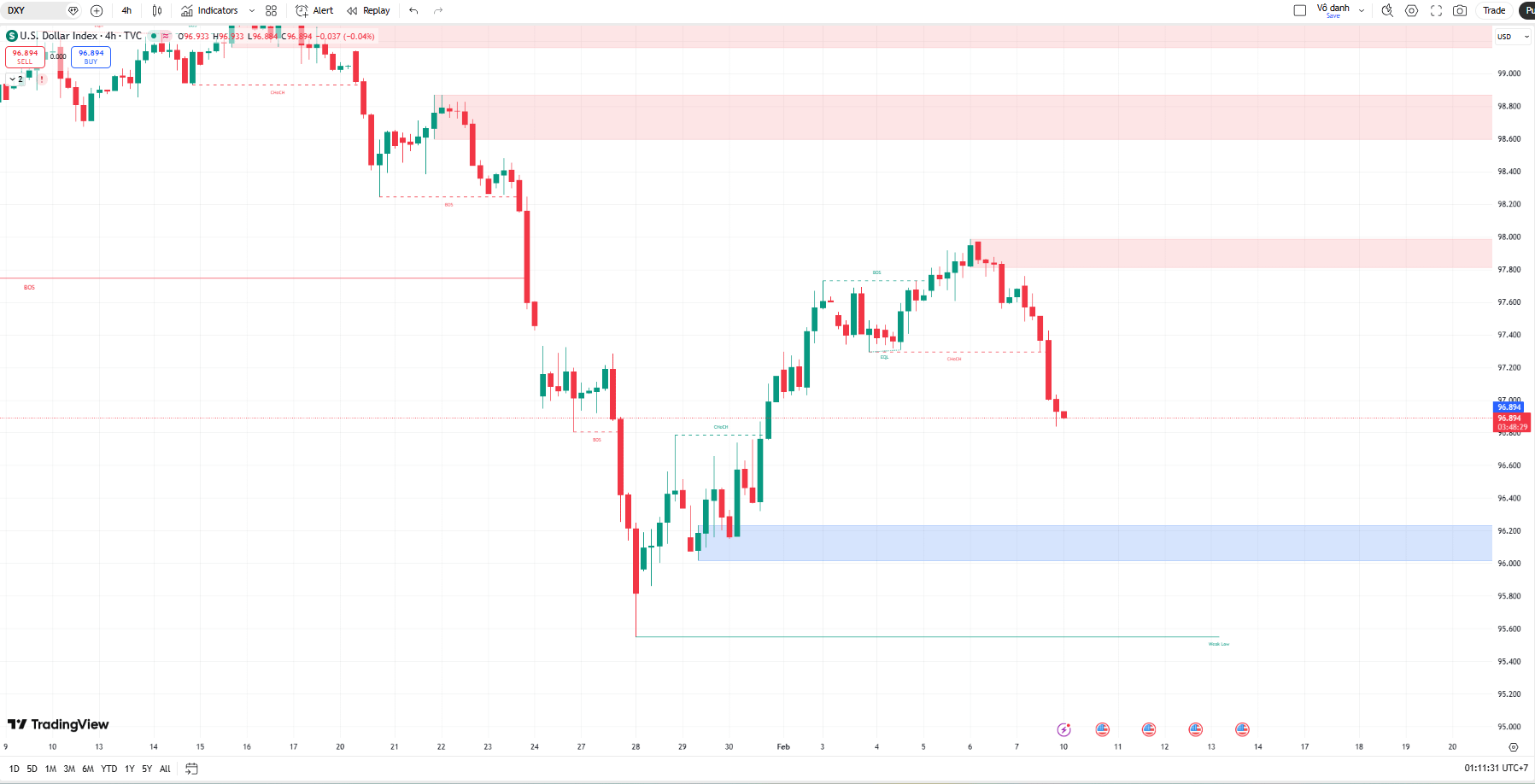 DXY đang hướng thẳng về vùng hỗ trợ màu xanh quanh mức 96.00 - 96.20. Nếu thủng vùng này, DXY sẽ tìm về Đáy yếu tại 95.60.