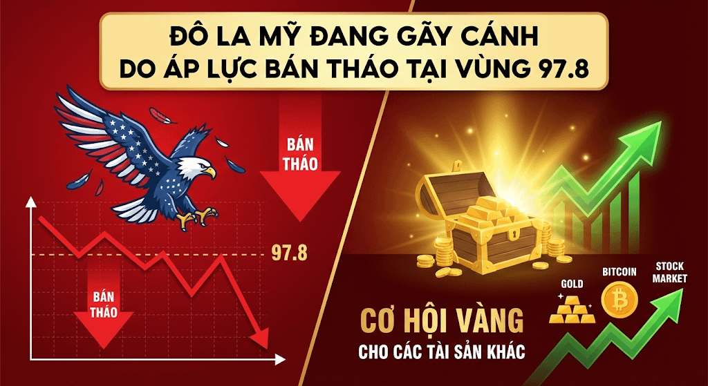 • Mối tương quan nghịch đảo giữa DXY và Vàng đang phát huy tác dụng tối đa. Khi DXY gãy mốc 97.8, Vàng đã bứt phá mạnh mẽ.