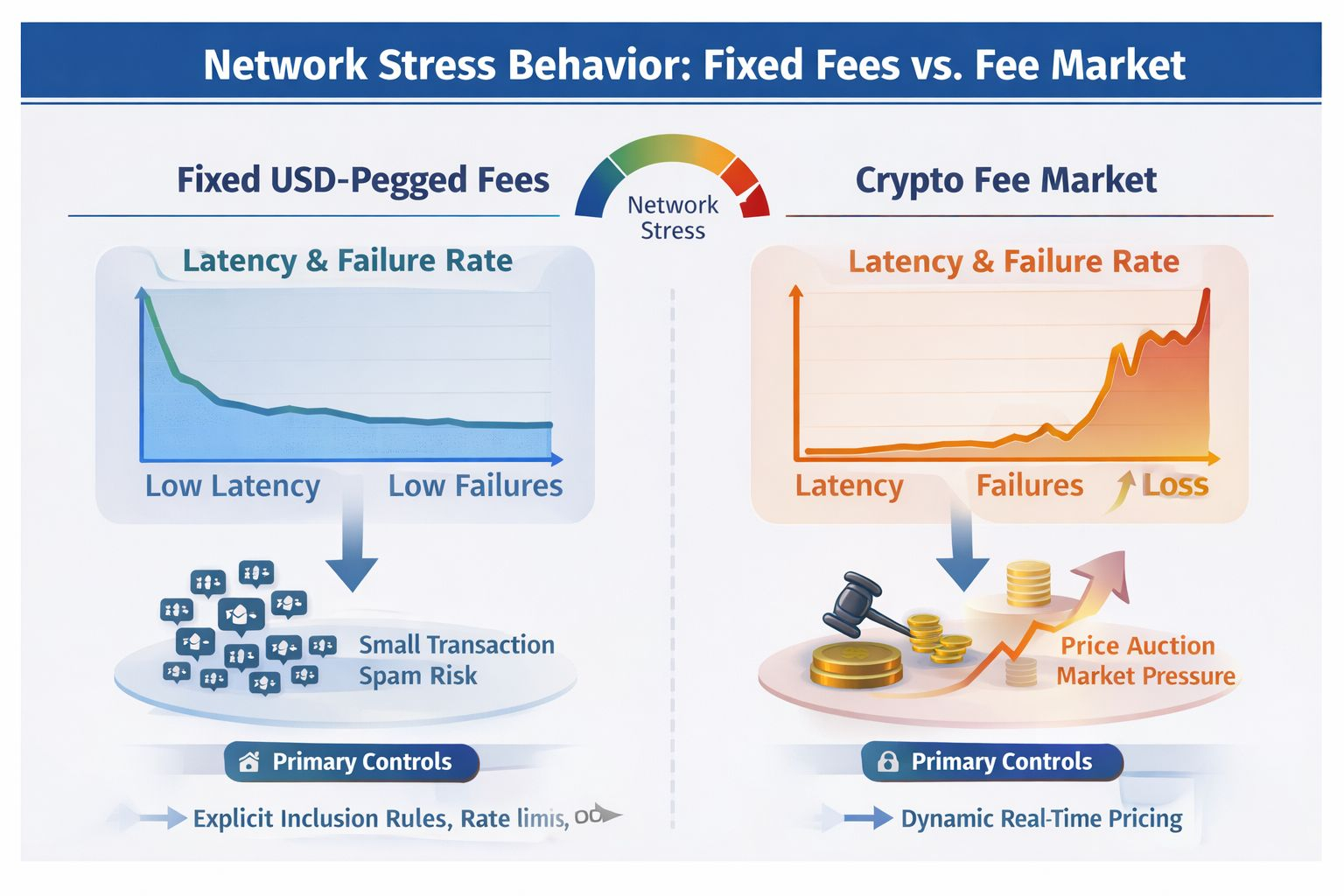 Una consecuencia de segundo orden es el control de congestión. Cuando las tarifas se mantienen intencionalmente bajas y estables, la red elige no usar el precio como el mecanismo principal de racionamiento bajo estrés. Eso significa que el comportamiento bajo estrés tiene que manejarse en otro lugar. El modelo de niveles ayuda contra “pocas transacciones grandes de aflicción” al hacer que la computación masiva sea costosa en términos de USD, pero es menos efectivo contra “muchas transacciones pequeñas” si estas permanecen en el nivel más bajo. Así que la verdadera pregunta institucional no es si las tarifas bajas son posibles; es qué sucede cuando la demanda se dispara. ¿La latencia de inclusión se degrada drásticamente? ¿Los validadores comienzan a filtrar o limitar tasas? ¿El protocolo introduce mínimos dinámicos o cuotas? Esos controles pueden ser legítimos para la fiabilidad del consumidor, pero necesitan ser explícitos porque definen quién se prioriza cuando la red está ocupada.