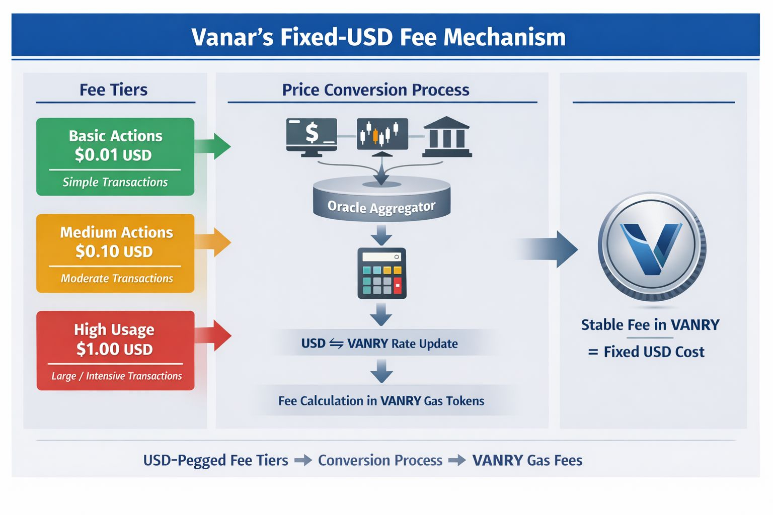 El mecanismo de tarifa fija en USD / predecible es el centro de gravedad. Vanar describe un plan de tarifas fijas escalonado donde las acciones rutinarias permanecen en un nivel de costo extremadamente bajo, mientras que las transacciones muy grandes o pesadas saltan a niveles de precios en USD mucho más altos. La intención es simple: permitir que las aplicaciones de consumo traten el costo de la cadena de bloques como un gasto estable en el backend, mientras se desalienta el abuso que consume grandes cantidades de computación. En la práctica, eso significa que la red traduce los objetivos de tarifas denominadas en USD en requisitos de gas denominados en VANRY utilizando un proceso de conversión de precios de VANRY que se actualiza según un cronograma.
