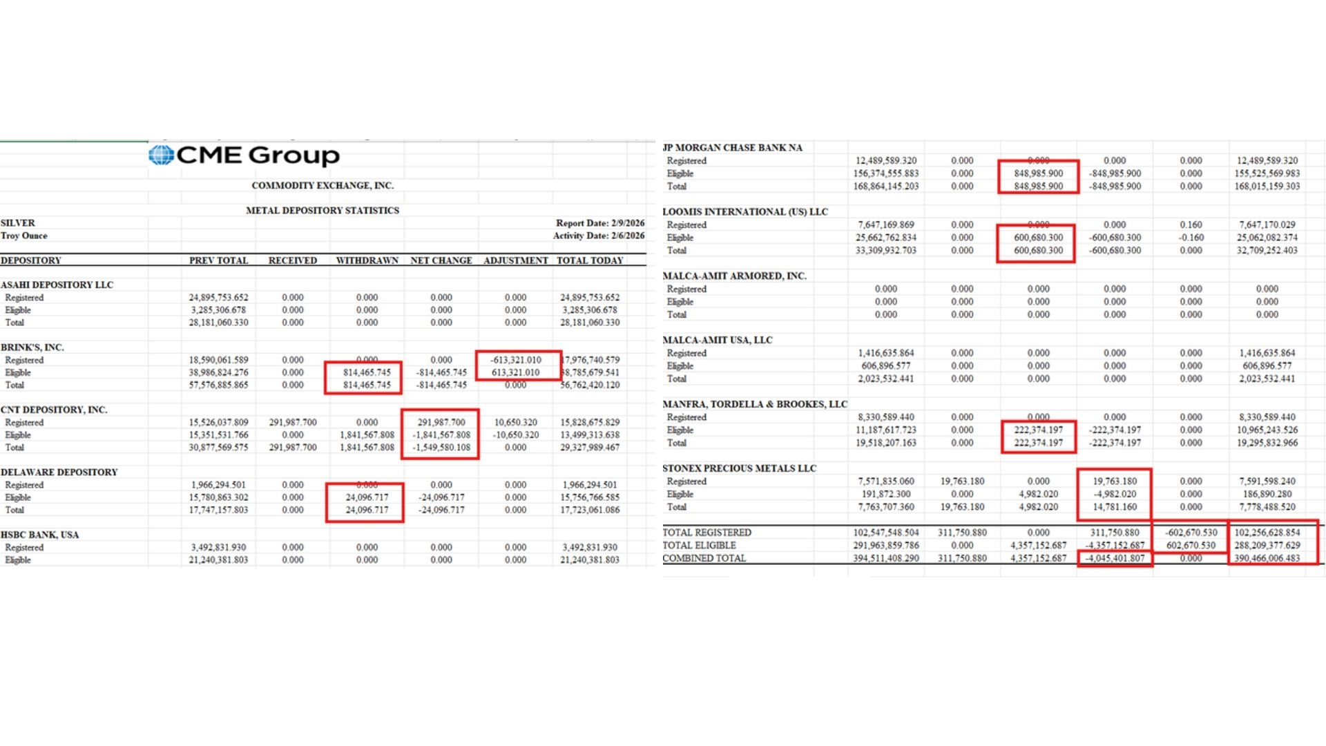 Los datos más recientes de la plataforma COMEX están causando conmoción en el mundo de la inversión en metales preciosos. En la sesión del día viernes, se produjo una ola masiva de retiro de oro$XAU blanco a gran escala en los mayores almacenes, sacando más de 4 millones de onzas de plata del sistema.