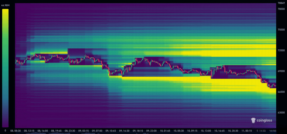 Ahora el mapa se está moviendo de nuevo. Se ha formado nueva liquidez alrededor de $65,000–$66,000, un imán cercano que todavía podría ser visitado. Pero más arriba, el premio mayor se encuentra entre $71,000–$74,000 donde las pilas son más gruesas. Si los toros logran recuperar el control, esa zona parece ser el destino más atractivo.
