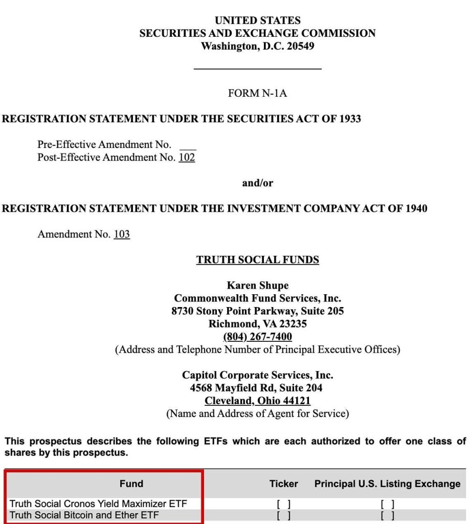 Trump Media es básicamente un fondo cripto ahora. Estas nuevas solicitudes ante la SEC para staking de BTC/ETH y un ETF "Cronos Yield Maximizer" prueban que la estrategia real es esa asociación de $6.4B con https://t.co/1C3jP5l6fB.