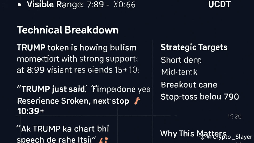 El token TRUMP está mostrando un momento alcista con un fuerte soporte en 8.00 y resistencia visible cerca de 10.50. Las velas se están apretando, el volumen está aumentando y el sentimiento se está desplazando hacia una ruptura.