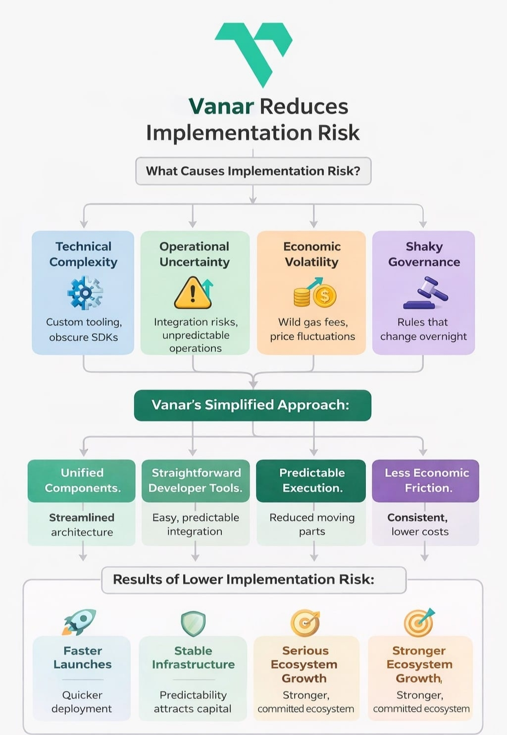Whenever I look at Vanar, I zero in on how it smooths out integration pain points. Most implementation risk boils down to four culprits: technical complexity, operational uncertainty, economic volatility, and shaky governance. Developers and enterprises get spooked by custom tooling, obscure SDKs, wild gas fees, or rules that change overnight.