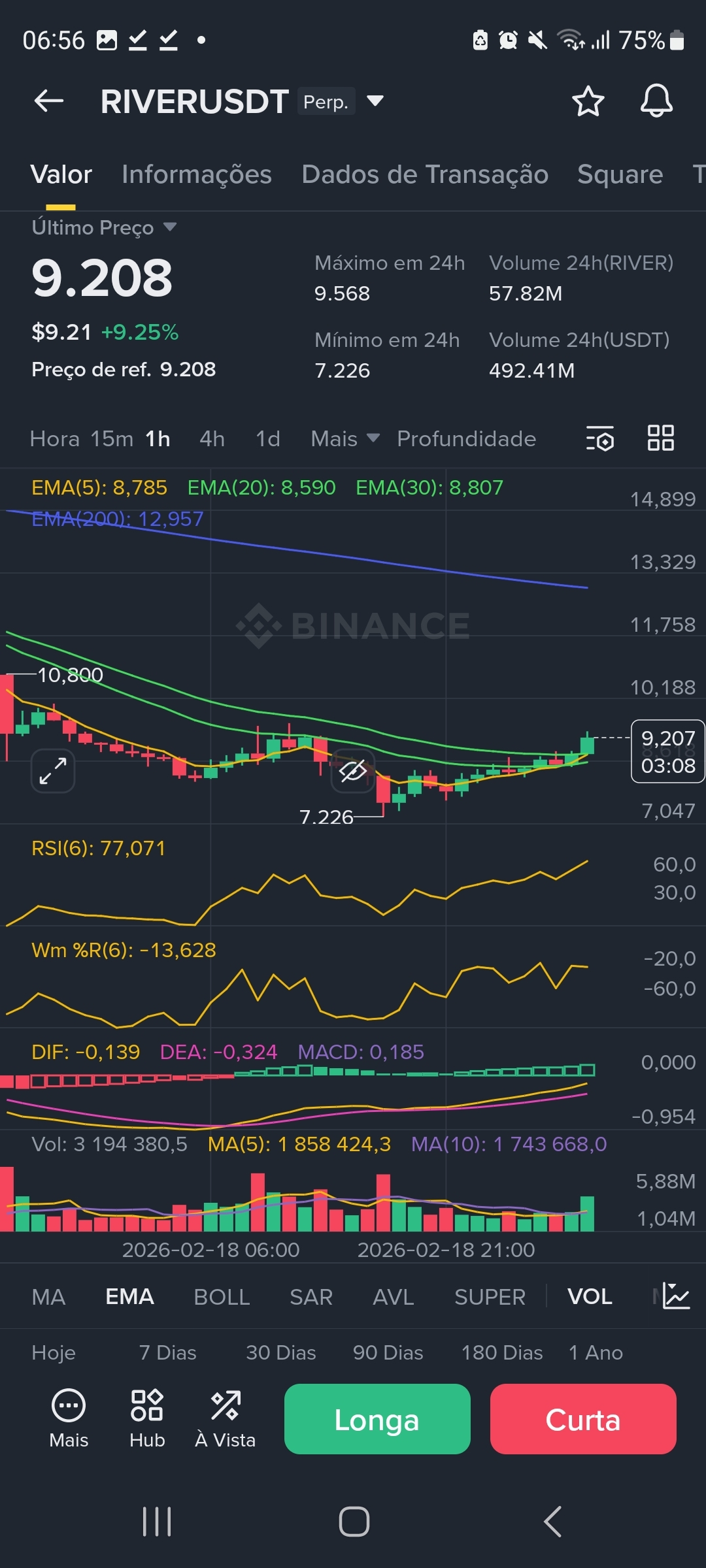 * RSI Extremo (0%): O RSI(6) em 1H está em 77.07, indicando força compradora, mas sem atingir o extremo de exaustão (>90) para reversão imediata ou sobrevenda extrema para entrada segura.