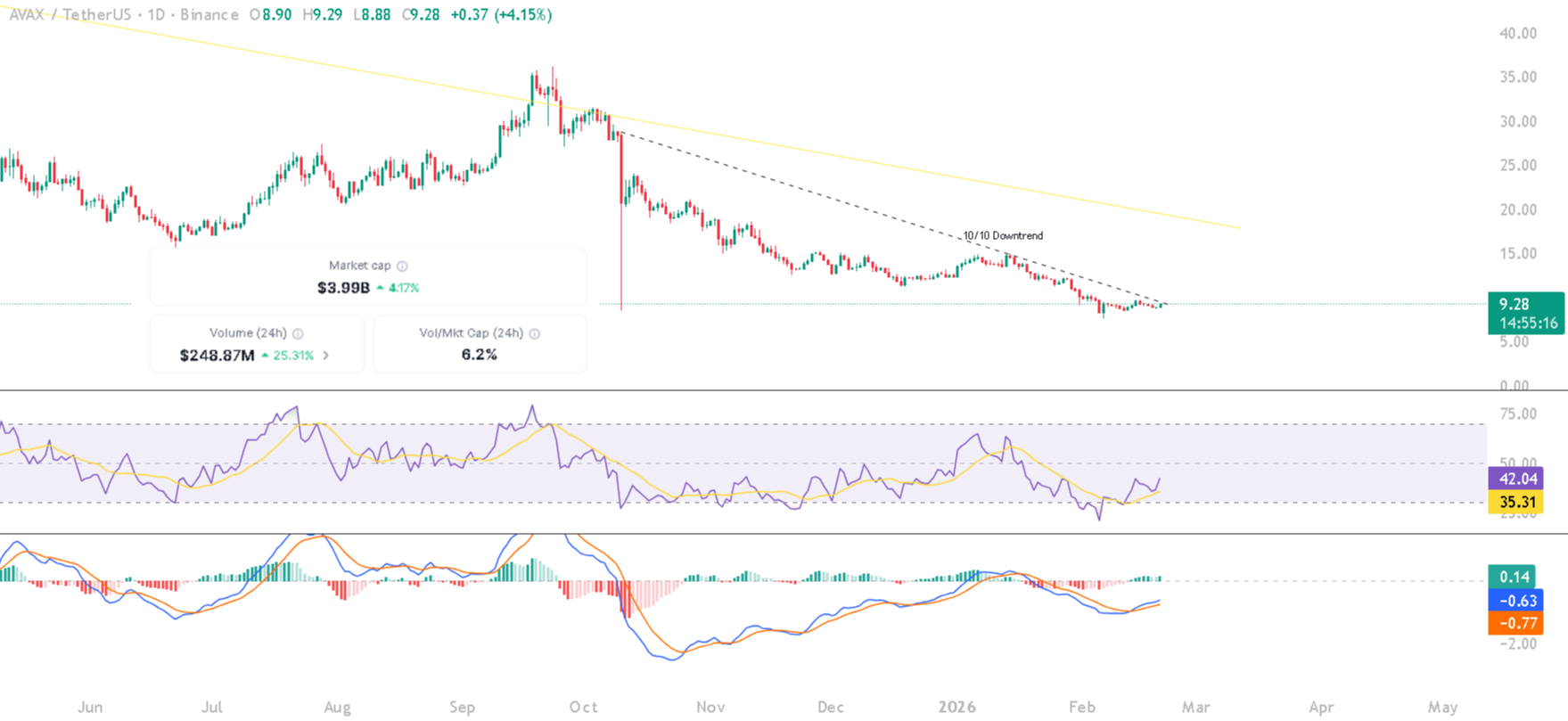 Después de varios meses sumido en rojo, $AVAX está mostrando signos de recuperación. Negociándose alrededor de $9.25, esta altcoin acaba de ver un volumen de transacciones dispararse un 25% hasta 248.87 millones de USD, empujando el precio directamente hacia la línea de tendencia bajista formada tras la brutal caída del 10 de octubre. La gran pregunta ahora es si AVAX tiene suficiente impulso para romper permanentemente esta resistencia macroeconómica que se ha prolongado durante años.
