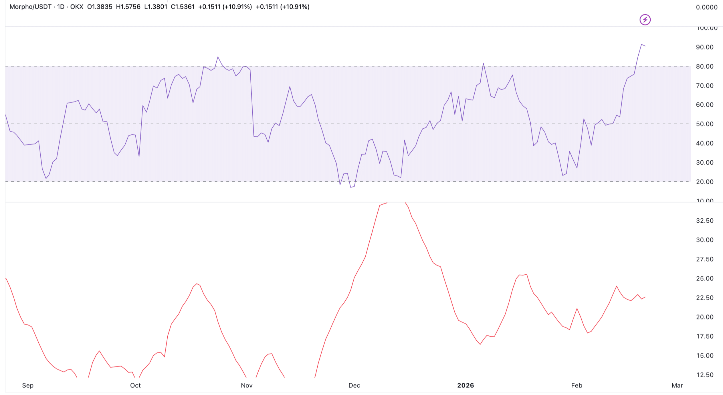 MORPHO experimenta un crecimiento de dos dígitos con un fuerte momentum ADX, pero alcanza un MFI sobrecomprado (>80) justo cuando enfrenta la resistencia de $1.54 y una gran zona FVG. Además, el flujo de dinero spot está vendiendo activamente durante este aumento. ¿Está comprando el rompimiento hacia $3.5, o está esperando una corrección debido a la gran presión de distribución spot?