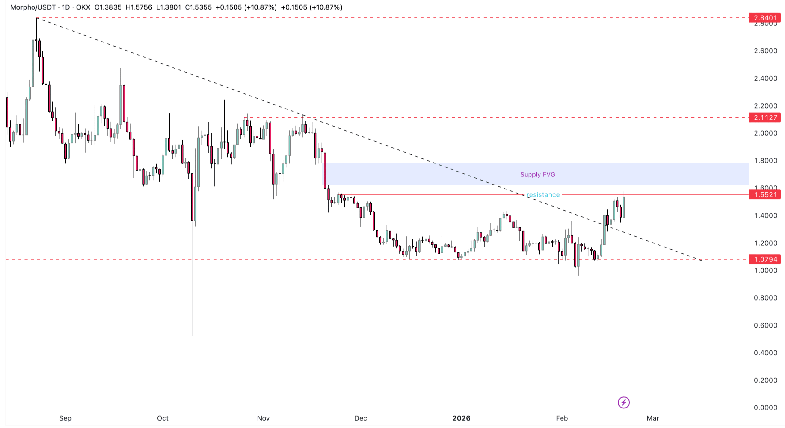 La reciente recuperación de MORPHO ha empujado el precio directamente hacia una resistencia importante en $1.54, un área que históricamente ha mostrado una fuerte presión de venta.