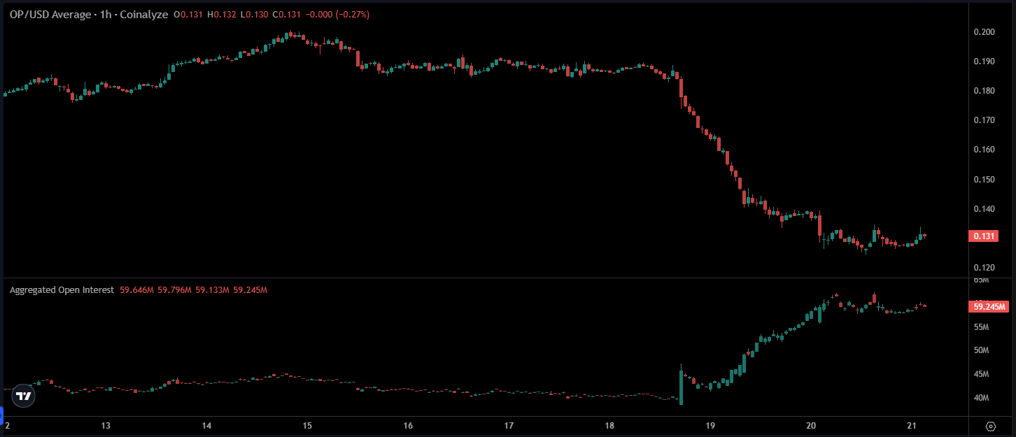 El índice RSI en el marco diario ha caído a un extremo de sobreventa de 22.5. Notablemente, el aumento de OI finalmente ha comenzado a desacelerarse cuando $OP encontró un punto de descanso temporal en el rango de $0.127–$0.130, señalando que la fase más agresiva de Short está llegando a su fin.