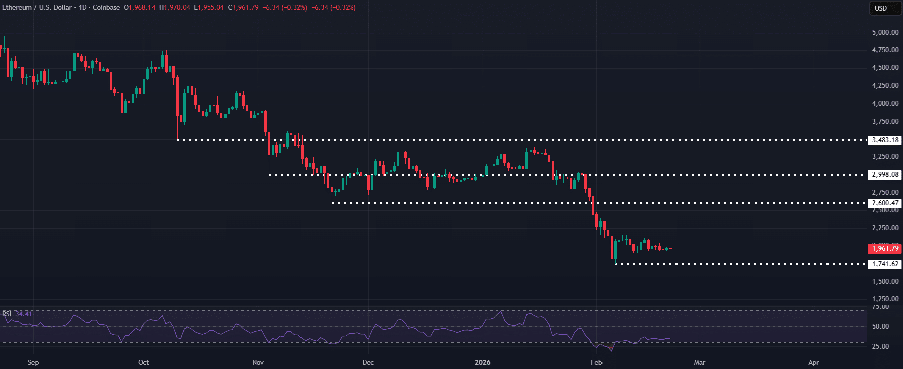 Desde el colapso de octubre, ETH ha creado 4 mínimos consecutivos más bajos sin poder convertir la resistencia clave en soporte. Combinado con la débil demanda al contado y los vientos en contra macroeconómicos de inflación, aranceles, regulaciones, la cantidad de liquidez atrapada arriba sigue siendo muy pesada.