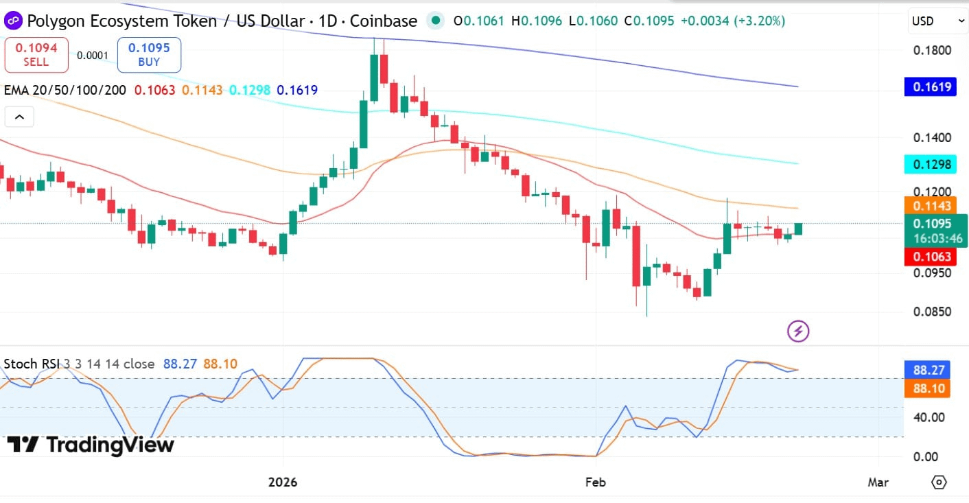 $POL đang giao dịch trong một biên độ rất hẹp nhưng đã bảo vệ thành công vùng hỗ trợ sinh tử $0.10. Bằng việc lật ngược đường trung bình động ngắn hạn EMA20, altcoin này hiện đang giao dịch quanh mức $0.108 tăng 4.06% trên biểu đồ ngày, được hậu thuẫn bởi mức tăng 17% về khối lượng giao dịch minh chứng cho hoạt động on-chain đang bùng nổ.