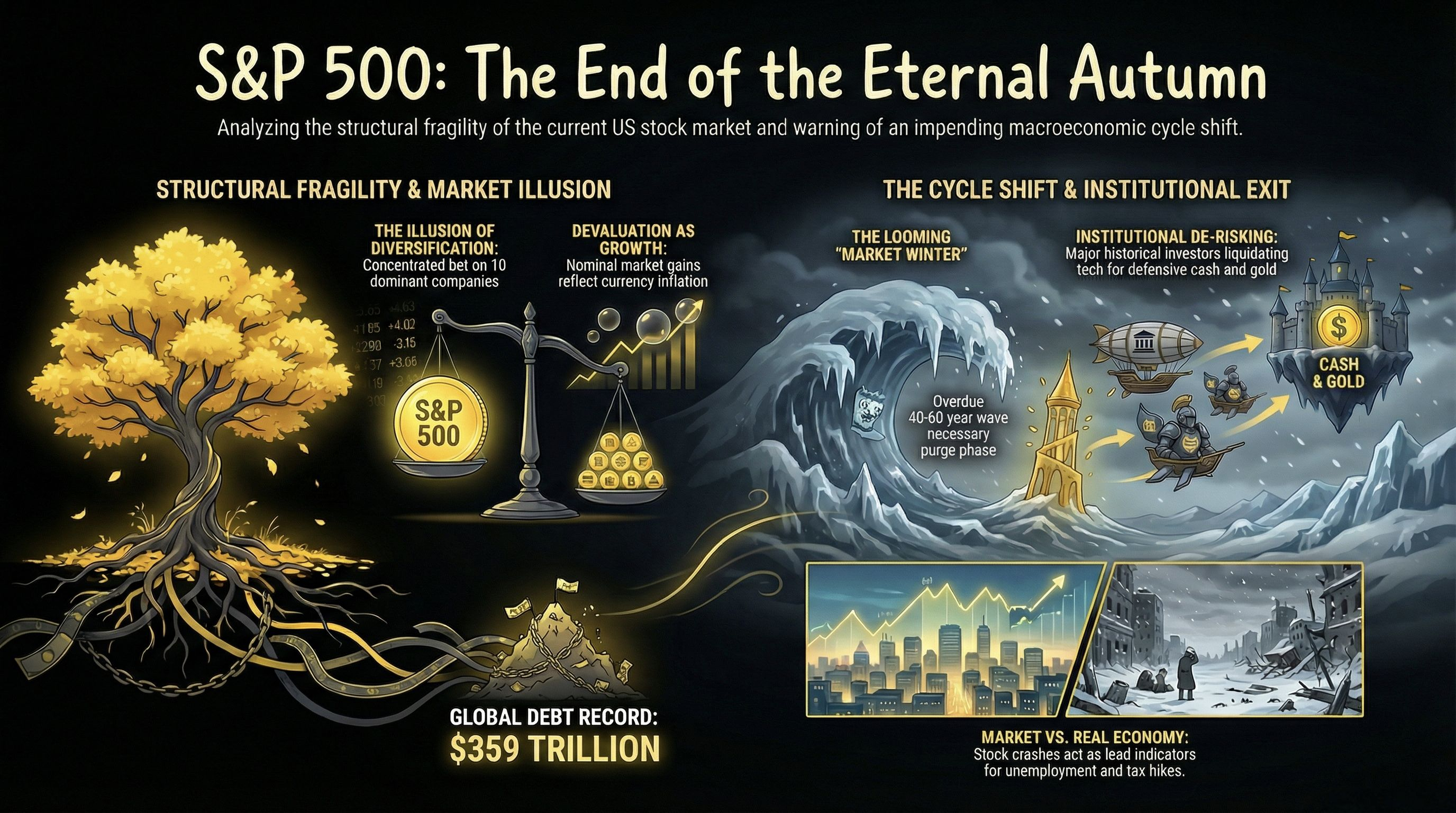 Desde la década de 1980, la política global se ha orientado hacia la extensión artificial de "Otoño." Al utilizar una política monetaria extrema y permitir que la deuda global se eleve a un récord de $359 billones, las autoridades financieras han bloqueado la llegada de "Invierno." Esta deuda ahora actúa como una barrera masiva para una corrección saludable; el sistema se ha vuelto tan frágil que no puede soportar la purga que requiere para reiniciarse.