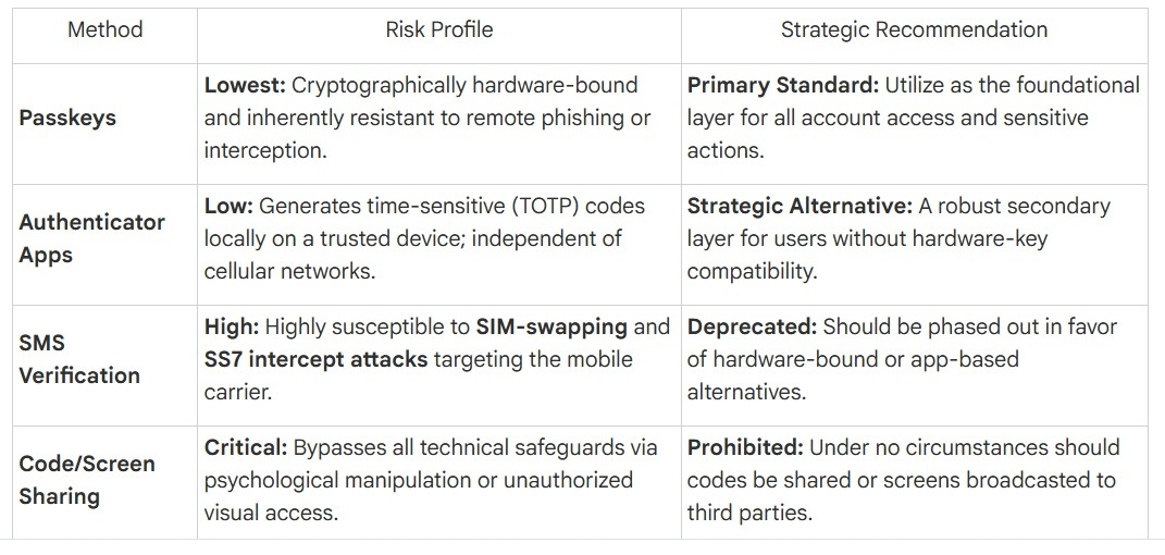 Un estratega sofisticado debe diferenciar entre los métodos de Autenticación de Segundo Factor (2FA) basados en sus vulnerabilidades técnicas subyacentes. Aunque la verificación basada en SMS ofrece conveniencia, es fundamentalmente defectuosa debido a su dependencia de la infraestructura de telecomunicaciones heredada. Por el contrario, las claves de acceso y las aplicaciones de autenticación ofrecen un techo de seguridad significativamente más alto al asegurar que el factor de autenticación permanezca ligado al hardware o generado localmente, aislado de la interceptación a nivel de red.