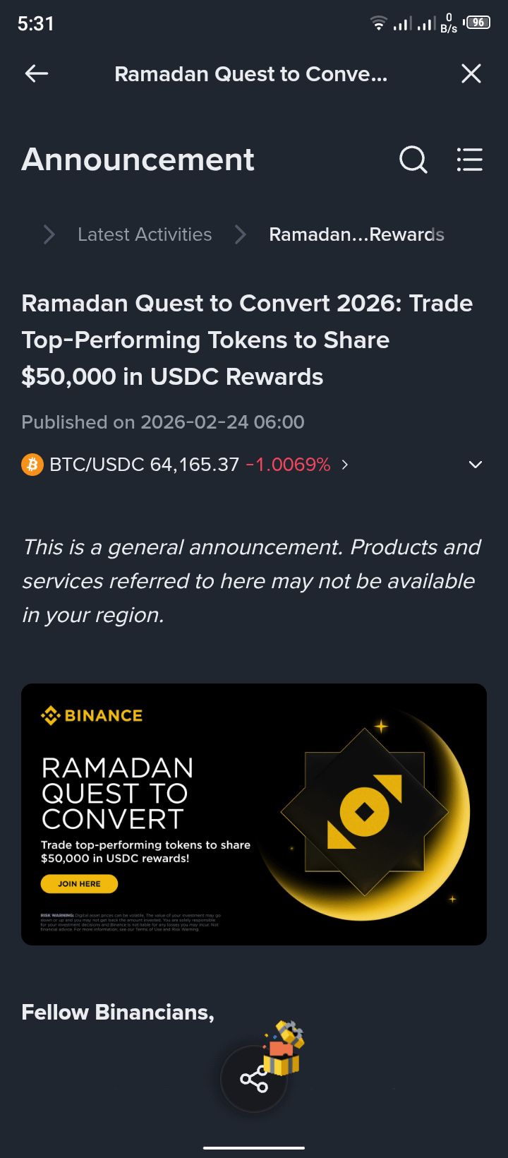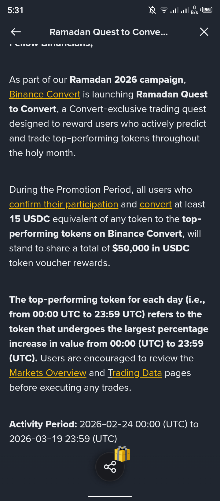 Binance Ramadan Quest to Convert 2026 — Win a Share of $50,000 in USDC!