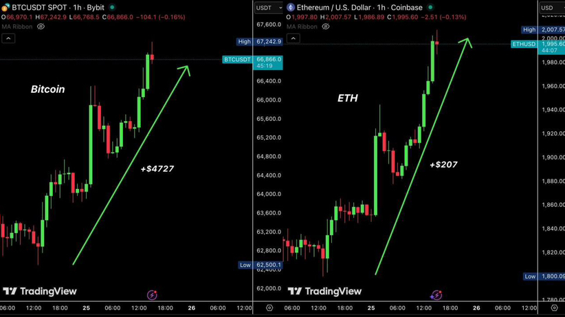 BTC vượt mốc 67.000 đô la và ETH vượt mốc 2.000 đô la. Bitcoin tăng 7,2%, tăng thêm 100 tỷ đô la vào vốn hóa thị trường trong 24 giờ qua. Ethereum tăng 11,5%, tăng thêm 23 tỷ đô la vào vốn hóa thị trường trong 24 giờ qua. Thị trường tiền điện tử đã tăng thêm 150 tỷ đô la so với mức đáy ngày hôm qua, thanh lý gần 300 triệu đô la các vị thế bán khống.