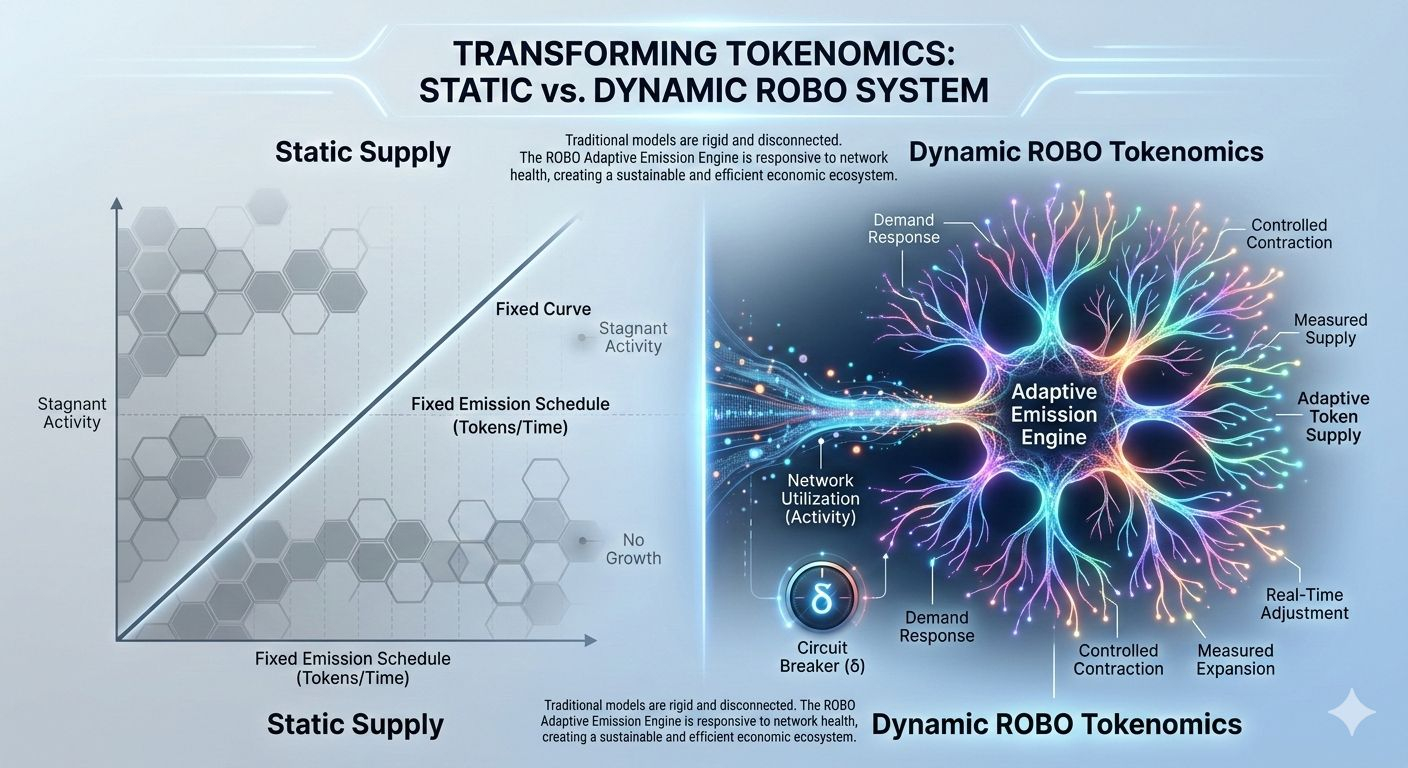 The real innovation inside ROBO is not just branding or narrative. It is how its Adaptive Emission Engine transforms token supply from a static schedule into a living monetary framework. Instead of releasing tokens blindly, ROBO embeds logic into its Emission Controller, allowing supply to react to network performance in real time.
