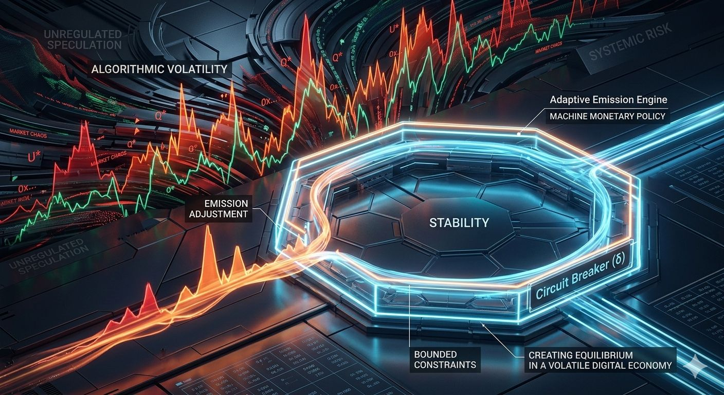 Financial systems can overreact. Algorithms can amplify volatility. The Circuit Breaker acts as a bounded constraint on emission adjustments. If metrics fluctuate too aggressively or exceed safe parameters, δ limits the magnitude of emission changes within a defined interval.