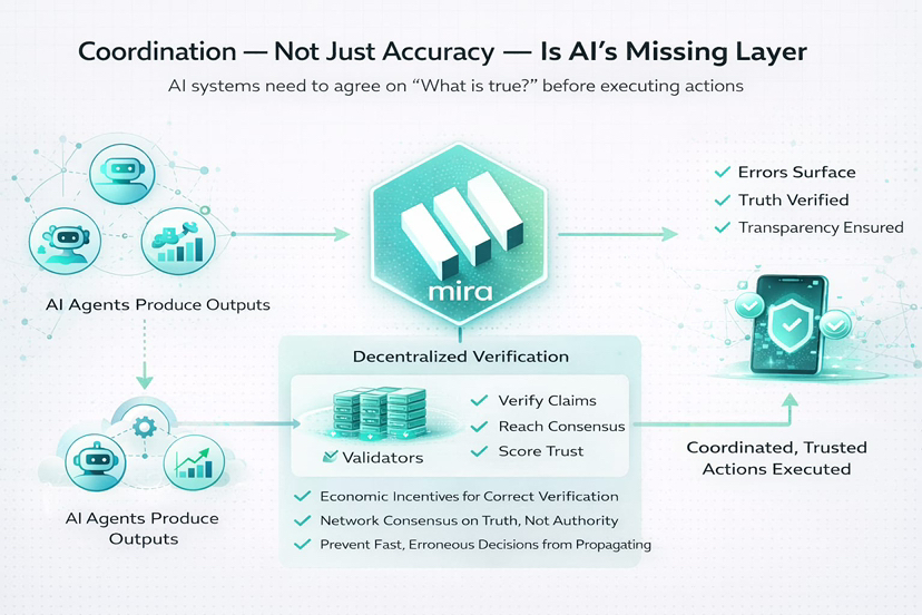 Durante mucho tiempo, pensé que la mayor debilidad de la IA era la precisión. Malas respuestas. Alucinaciones. Tonterías confiadas. Pero cuanto más observaba la escalabilidad de los sistemas de IA, más me daba cuenta de que la precisión es solo el problema a nivel superficial. El problema más profundo se encuentra debajo: la IA no sabe cómo coordinar la verdad a gran escala.