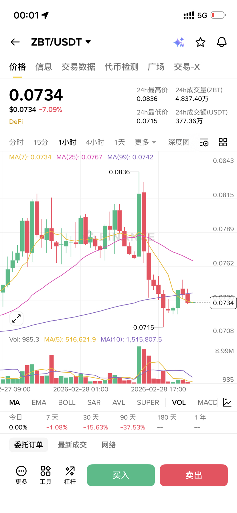 Stop-loss de hierro (SL): $0.0710. Si cae por debajo del mínimo absoluto de 24 horas de $0.0715, indica que el capital principal ha abandonado la resistencia o nuestra lógica ha fallado por completo, se debe salir sin condiciones, conservando las montañas verdes para no temer quedarse sin leña.