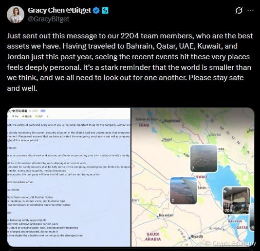 Gracy Chen, CEO de Bitget, publicó una declaración en X dirigida a más de 2,200 empleados en el área, cubriendo compromisos sobre la cobertura total del salario, alojamiento temporal, reubicación, suministros de emergencia, gastos médicos y vuelos de evacuación si es necesario.