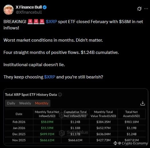 Los ETF de XRP spot capturaron $58.06 millones en entradas netas durante febrero, según datos publicados por X Finance Bull — un salto considerable desde los $15.59 millones registrados en enero. El resultado destaca dado el telón de fondo de alta volatilidad y episodios de liquidaciones masivas que borraron decenas de miles de millones de dólares del mercado en pocas horas.