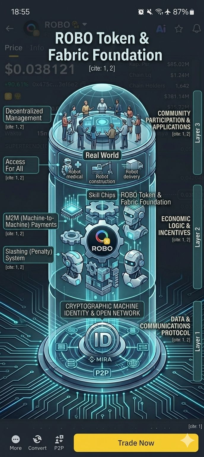Lapisan ini mengelola logika ekonomi dan memastikan semua pihak selaras. Token ROBO adalah jantung dari lapisan ini: