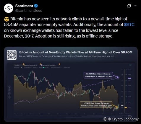 La red de Bitcoin nunca ha tenido tantos usuarios como hoy. A partir del 6 de marzo de 2026, el número de billeteras no vacías alcanzó 58.45 millones, un máximo histórico que supera los picos registrados durante los mercados alcistas de 2021 y 2025. Al mismo tiempo, el suministro disponible en intercambios conocidos cayó a 1.17 millones de BTC, la cifra más baja desde diciembre de 2017. El hecho de que ambos indicadores se muevan en la misma dirección simultáneamente no es una coincidencia.