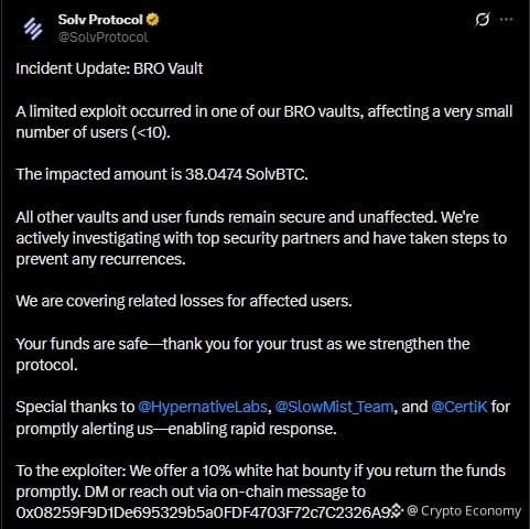 Solv Protocol confirmó que compensará a los usuarios afectados por la pérdida total de 38.05 SolvBTC. El protocolo también ofreció una recompensa del 10% sobre los fondos robados si el atacante los devuelve a la dirección designada. Hasta ahora, no ha habido respuesta de la parte responsable de la explotación.