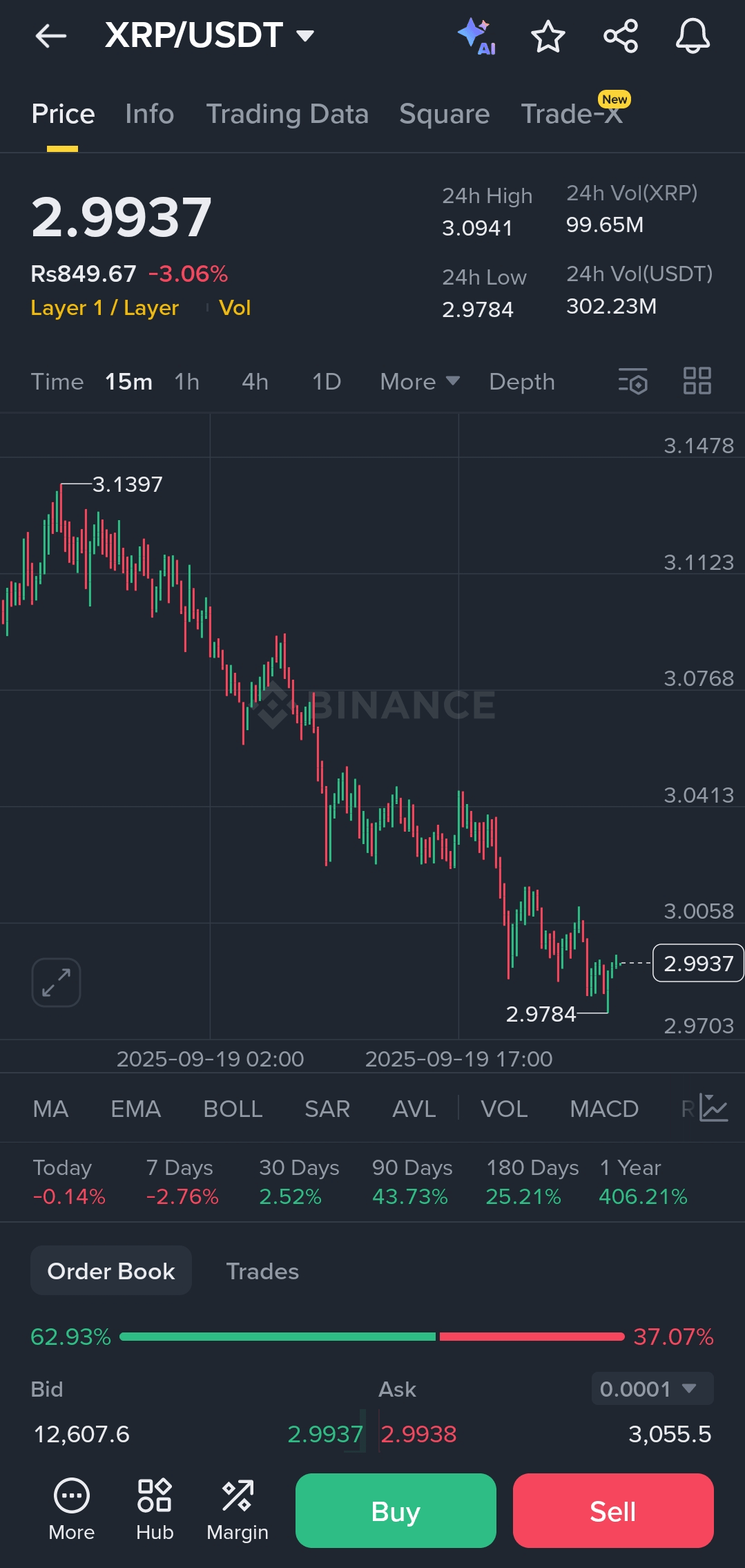 A partir del 19 de septiembre de 2025, XRP/USDT se cotiza a $2.9937, mostrando un descenso del 3.06% en las últimas 24 horas. El máximo de 24 horas alcanzó $3.0941, mientras que el mínimo llegó a $2.9784, lo que indica un rango de negociación estrecho y una fase de consolidación.