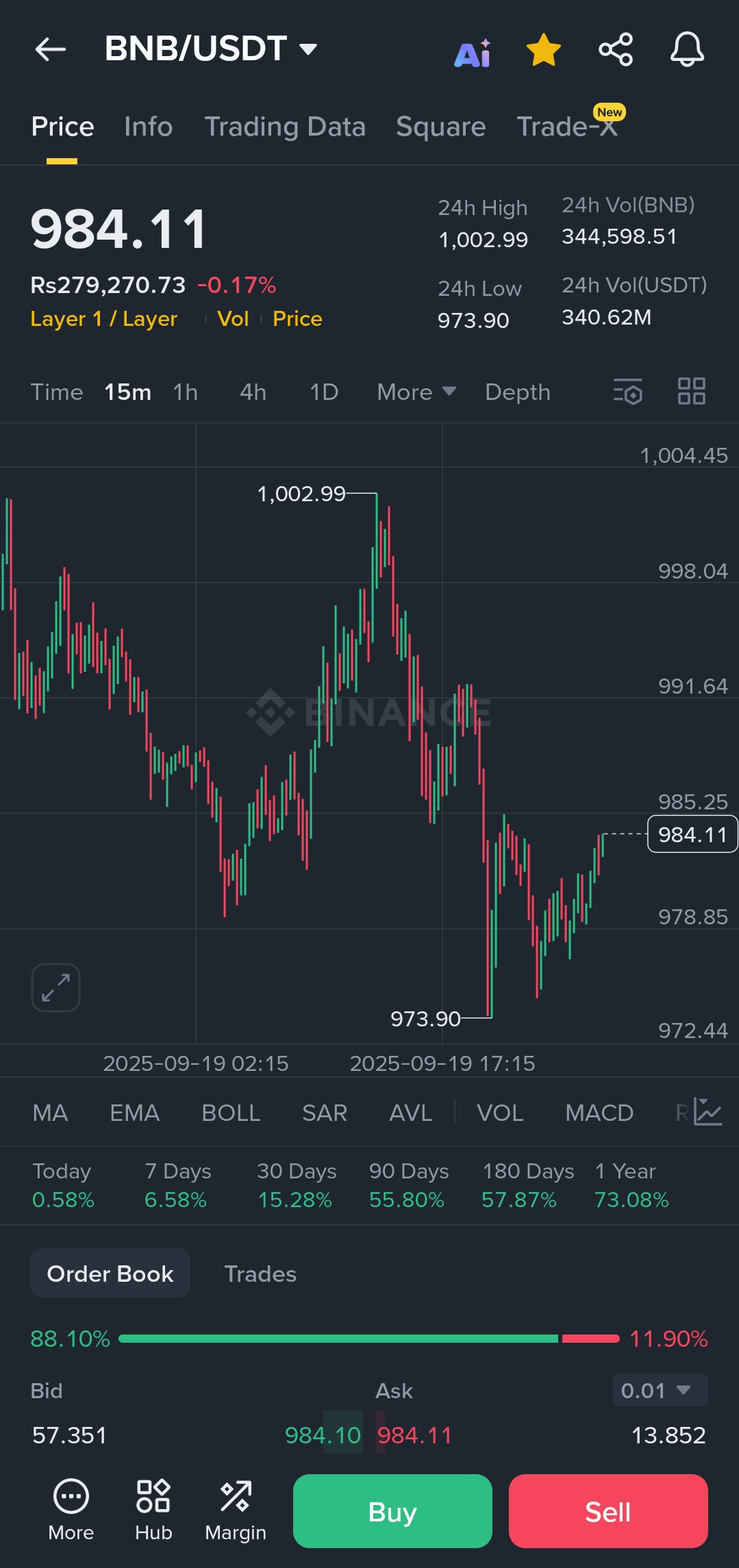 BNB se está comercializando actualmente a $984.11, reflejando una ligera disminución diaria de -0.17%. La criptomoneda registró un máximo de 24 horas de $1,002.99 y un mínimo de $973.90, mostrando una volatilidad moderada durante el día.