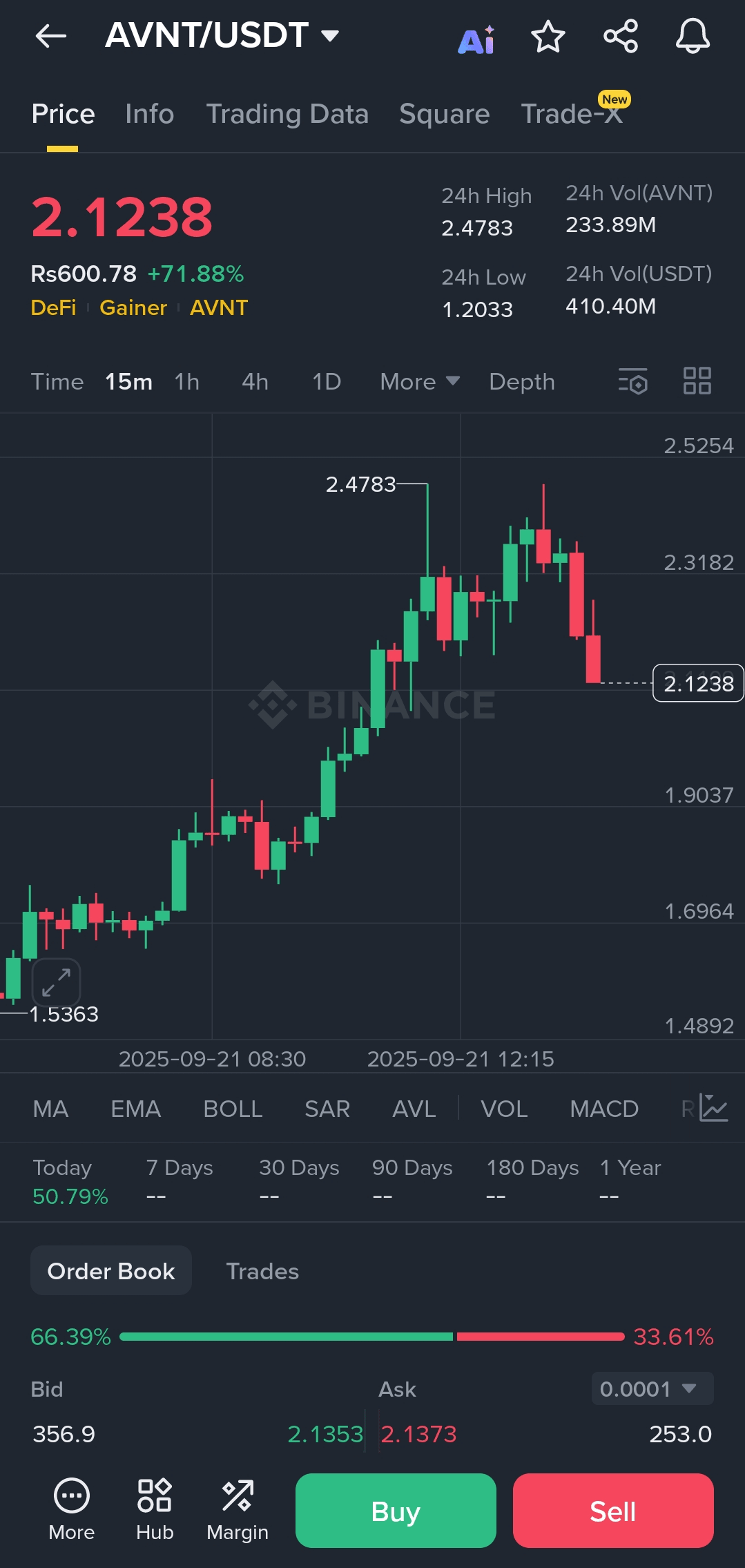 Interpretación: El enorme rango de precios (de ~1.20 a ~2.48) y el colosal volumen de USDT de más de 410 millones significan un activo altamente volátil que experimenta un breakout significativo o un evento impulsado por noticias. El volumen confirma la legitimidad del movimiento; no es un bombeo de baja liquidez.