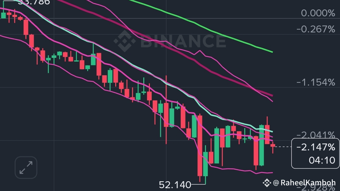 · Gráfico de 15M: El precio se está enrollando dentro de un rango ajustado. Las EMAs (10, 20, 50) están convergiendo alrededor de 52.50. Se avecina una compresión, y está lista para explotar hacia arriba.