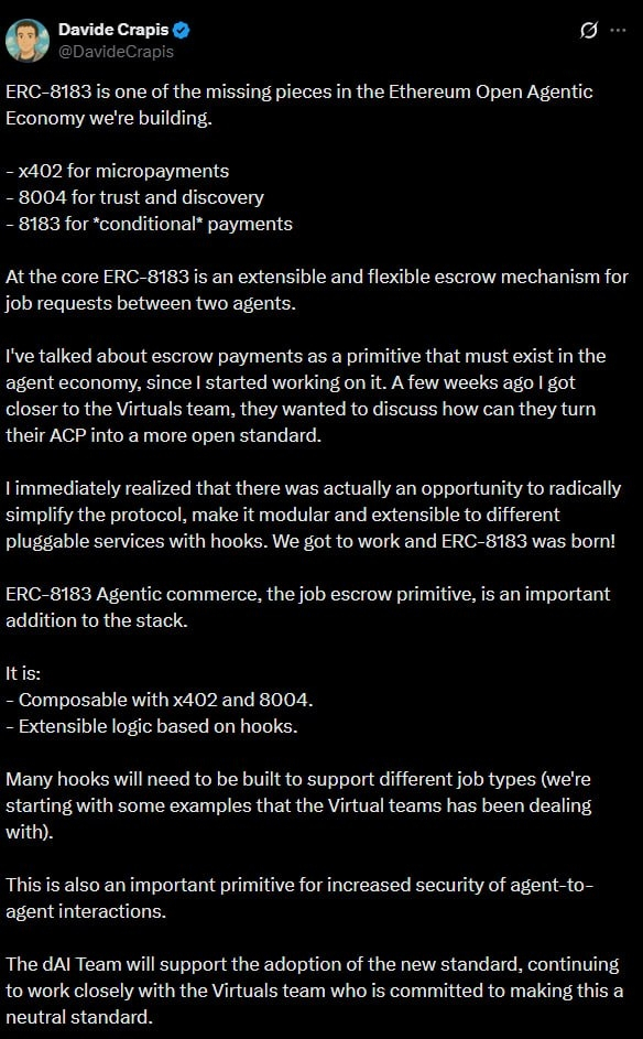 ERC-8183 es uno de los elementos que faltan en la economía de agentes abierta que estamos creando en Ethereum. — x402 para micropagos — 8004 para confianza y detección — 8183 para *pagos* *condicionales*.