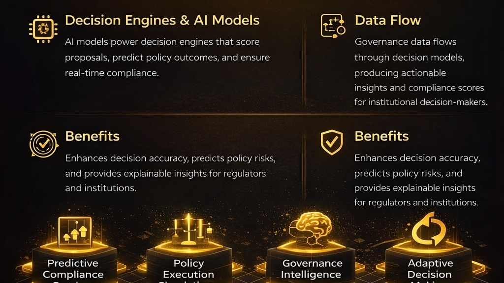 En el centro de la Capa de Inteligencia se encuentran los Motores de Decisión, un conjunto modular de sistemas analíticos impulsados por IA que interpretan acciones de gobernanza y proporcionan salidas estructuradas.