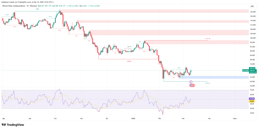El precio actual de Bitcoin se sitúa en aproximadamente $70,600, después de registrar un movimiento ascendente de cerca del 4-5% en las últimas 24 horas y un volumen diario que supera los $50 mil millones, reflejando un aumento significativo en la actividad del mercado y un repunte en la participación institucional y minorista.