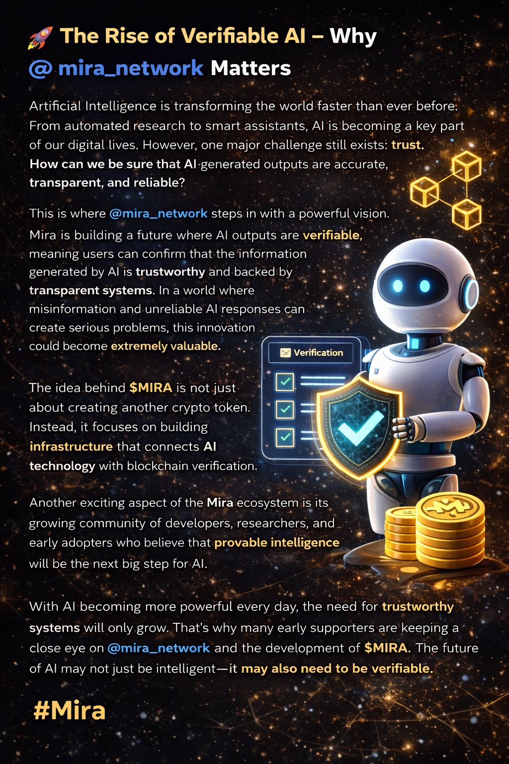 Con la IA volviéndose más poderosa cada día, la necesidad de sistemas confiables solo crecerá. Por eso, muchos de los primeros seguidores están prestando mucha atención a @mira_network y el desarrollo de $MIRA. El futuro de la IA puede no ser solo inteligente; también puede necesitar ser verificable.