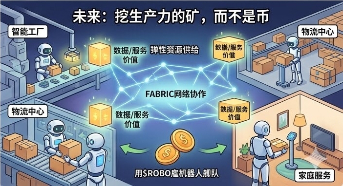 Pero la minería definida por Fabric es la extracción de productividad, la minería de datos, la minería de servicios. Las fábricas, los centros logísticos e incluso los hogares del futuro podrían convertirse en minas. Los robots $ROBO transportan mercancías, patrullan seguridad y mantienen equipos; cada acción que completan es una forma de extraer valor a través del mecanismo PoRW.
