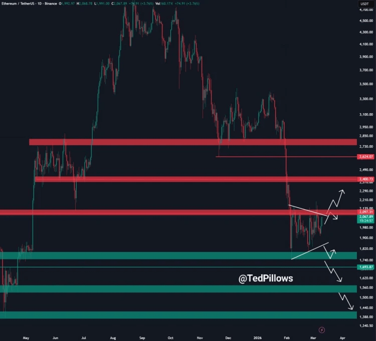 Pero ojo, que aquí no venimos a adivinar, sino a analizar los datos fríos. En el gráfico diario que comparte TedPillows, la zona de los $2,150 es nuestra verdadera prueba de fuego. Ya recuperamos el soporte psicológico de los $2,000 (que nos da un respiro), pero para cantar victoria necesitamos que esos $2,150 dejen de ser un muro y se conviertan en nuestro nuevo piso. Si los compradores mantienen el control y rompemos esa barrera, la siguiente parada lógica son los $2,400, una zona que históricamente ha sido un punto de mucha acción y consolidación. 🧱🔨