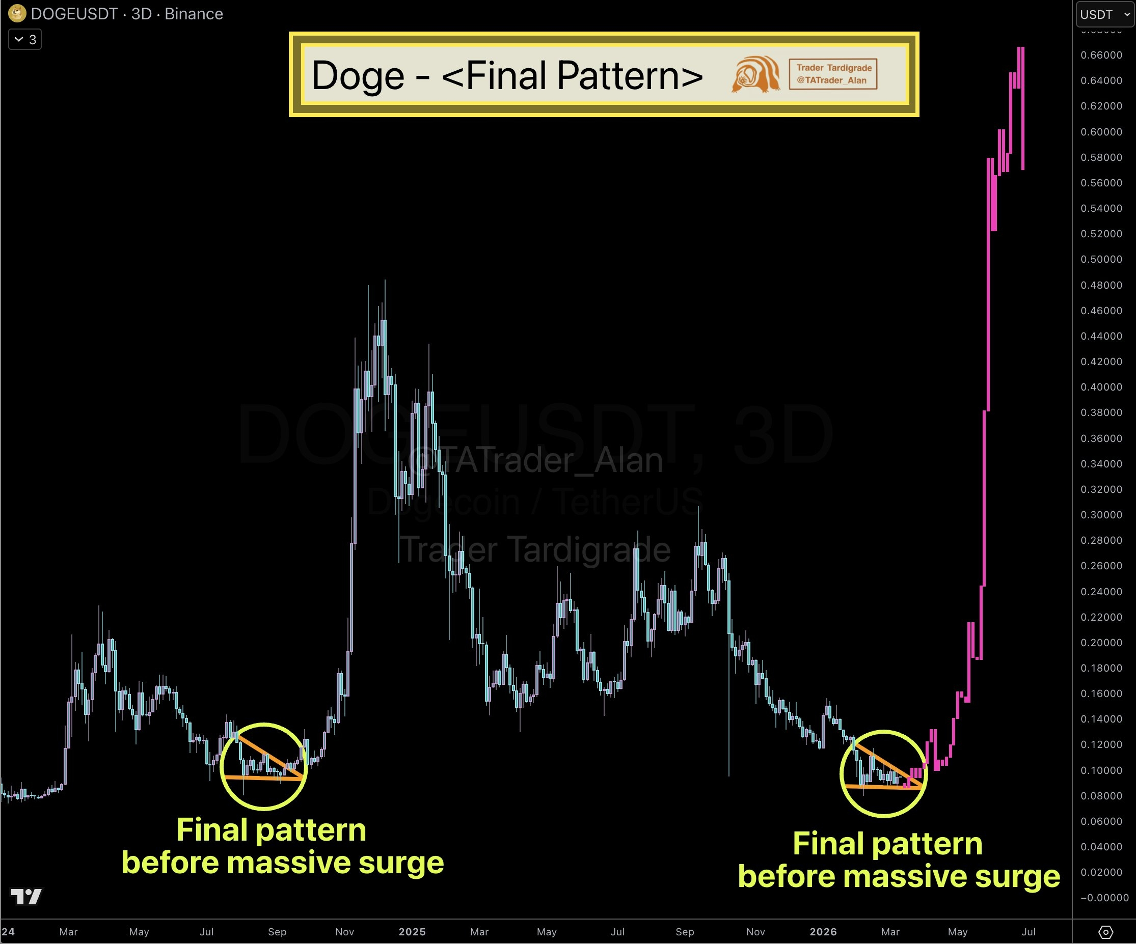 Pero ojo a esto, familia, porque aquí es donde la cosa se pone buena: mientras el gráfico diario nos da dolores de cabeza, el análisis a largo plazo (el de 3 días) está dibujando un patrón que los expertos ya han visto antes. Algunos analistas, como Tardigrade, dicen que esta estructura es idéntica a la que precedió el bombazo de 2024. Si la historia se repite y logramos romper el rango actual con un cambio de impulso real, el objetivo loco pero técnico está en los $0,60. ¡Estamos hablando de un salto potencial del 553%! 🚀
