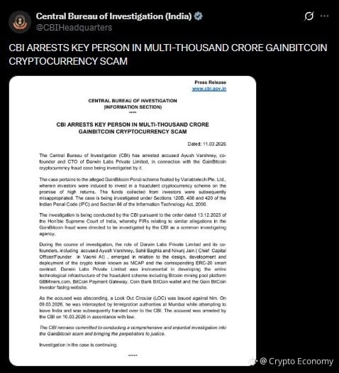 La Oficina Central de Investigación (CBI) de la India arrestó a Ayush Varshney, cofundador y director de tecnología de Darwin Labs Private Limited, como parte de la investigación sobre el esquema fraudulento GainBitcoin.