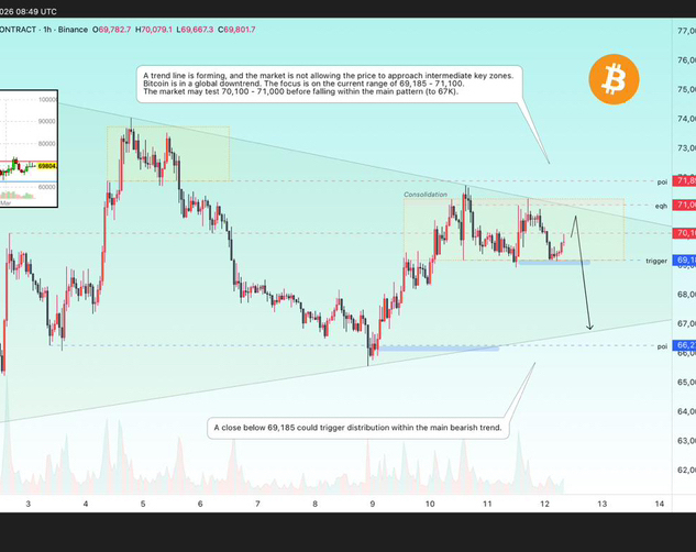 A trend line is forming, and the market is not allowing the price to reach intermediate key areas of interest, which indicates the presence of bearish pressure. Bitcoin is in a global downtrend. Focus on the current range of 69,185 - 71,100. The market may test 70100 - 71000 before falling within the main figure (to 67K).