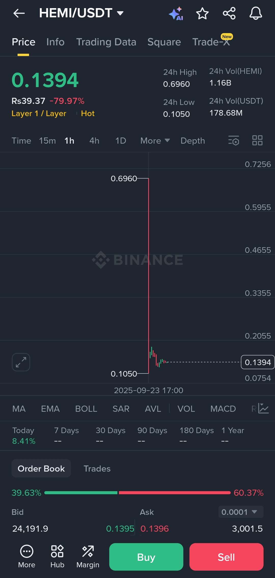 Esta fuerte caída ha dejado a muchos traders sorprendidos, ya que se registraron miles de millones en volumen de trading. Solo en las últimas 24 horas, se intercambiaron 1.16 mil millones de tokens HEMI, con un volumen de trading de 178.68 millones de USDT.