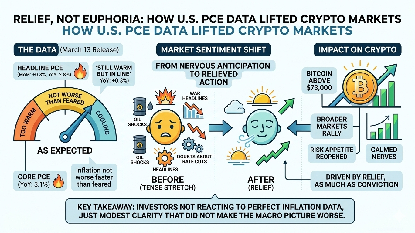 El mercado de criptomonedas respiró un aire fresco después de que el último informe del PCE de EE. UU. le dio a los comerciantes algo que deseaban con ansias: inflación que no estaba empeorando más rápido de lo temido. La publicación del 13 de marzo mostró un PCE general aumento del 0.3% mes a mes y un 2.8% año tras año, mientras que el PCE subyacente se situó en un 3.1%. Eso sigue siendo demasiado cálido para la comodidad de la Fed, pero fue lo suficientemente cercano a las expectativas como para calmar los nervios después de un período tenso marcado por choques petroleros, titulares de guerra y nuevas dudas sobre recortes de tasas a corto plazo. Bitcoin superó los $73,000 a medida que los mercados más amplios también se recuperaron, lo que indica que este movimiento fue impulsado tanto por el alivio como por la convicción. Lo que hace que la historia sea tendencia ahora es el cambio de tono: los inversores no están reaccionando a datos de inflación perfectos, solo a un informe que no empeoró la imagen macroeconómica. En este mercado, incluso una claridad modesta puede reabrir el apetito por el riesgo.