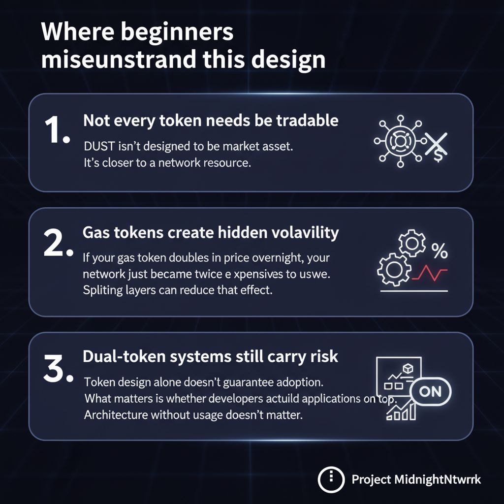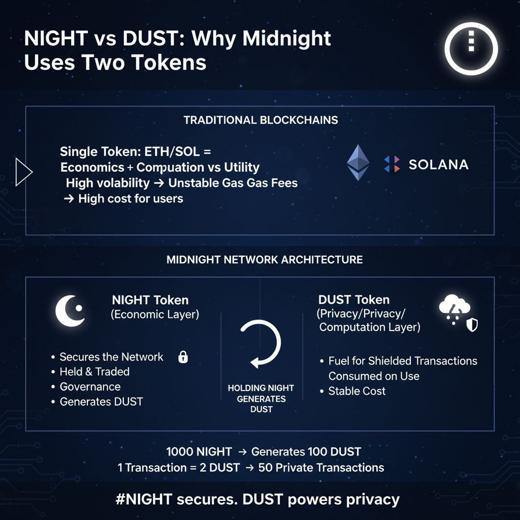 Instead of one token handling both economics and computation, Midnight separates the system into two layers: $NIGHT and DUST. This design is meant to support privacy focused applications without breaking the economic model of the network.