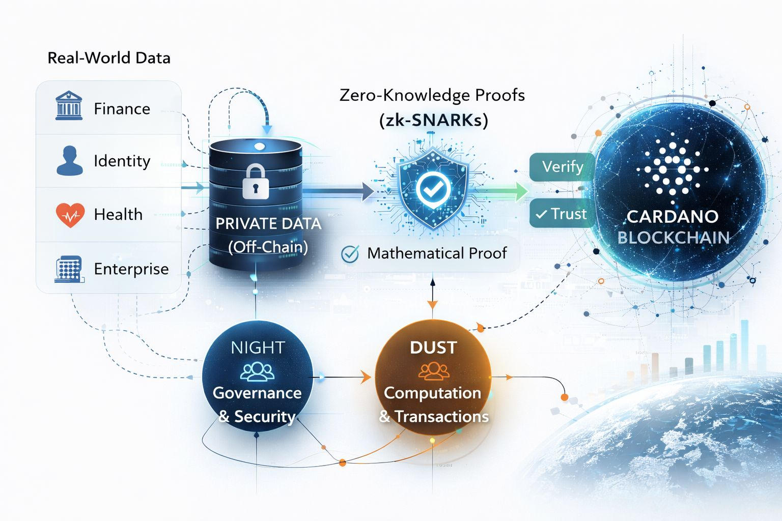 In Midnight’s architecture, sensitive data stays off-chain. Instead of publishing raw information to the blockchain, the system submits a mathematical proof showing that the rules governing that data were satisfied.