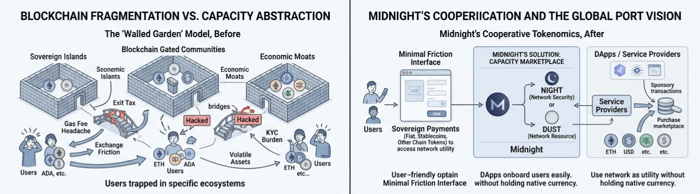 He estado mirando a Midnight últimamente porque parecen darse cuenta de que este enfoque aislacionista es un callejón sin salida para la adopción en el mundo real. Están tratando de pivotar hacia lo que llaman tokenómica cooperativa, que en realidad es solo una forma elegante de decir que quieren ser el tejido conectivo en lugar de otro silo. El núcleo de su argumento se basa en esta idea de un mercado de capacidad. En la antigua forma de hacer las cosas, si querías usar una red, tenías que ir a un intercambio, KYC tu vida, comprar un activo volátil y averiguar cómo pagar gas. Midnight está tratando de abstraer toda esa tontería separando el token que asegura la red, que llaman NIGHT, del recurso realmente utilizado para trabajar, que llaman DUST.