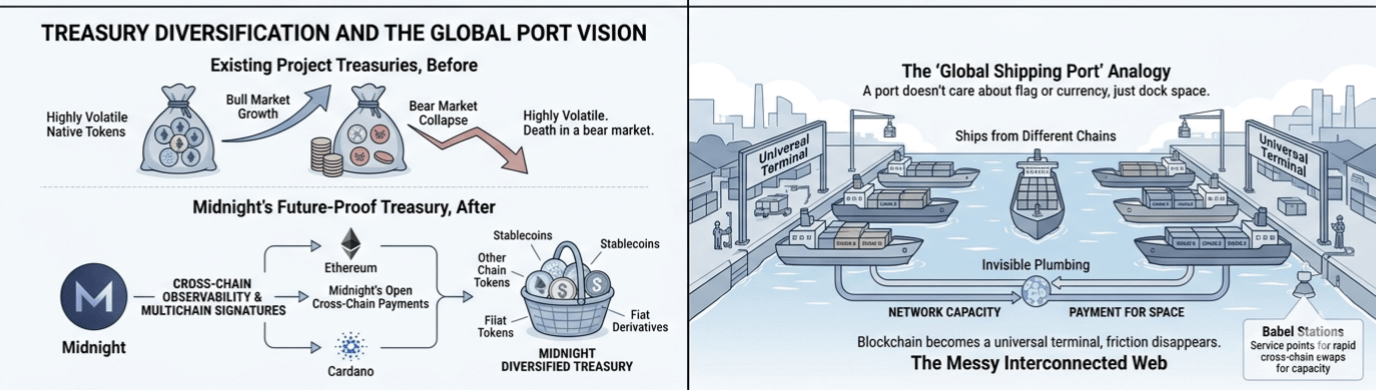 La visión se vuelve aún más ambiciosa cuando miras cómo esto afecta al tesoro subyacente. Por lo general, un tesoro de proyecto es solo una bolsa masiva de sus propios tokens altamente volátiles, lo cual es genial en un mercado alcista y una sentencia de muerte en un mercado bajista. Debido a que Midnight está abriendo las puertas a pagos entre cadenas a través de este mercado, su tesoro puede realmente diversificarse en activos de otras redes. Estamos hablando de un futuro donde la estabilidad de una red está respaldada por una cesta de activos que ni siquiera emite. Están apoyándose en cosas como la observabilidad entre cadenas y las firmas multichain para hacer que esto funcione, permitiendo esencialmente que la red vea y actúe sobre otras blockchains como Ethereum o Cardano. Es la primera vez que he visto a un proyecto admitir que el futuro no es una cadena para gobernarlas a todas, sino una red desordenada e interconectada donde el ganador es quien haga que la plomería sea más invisible.